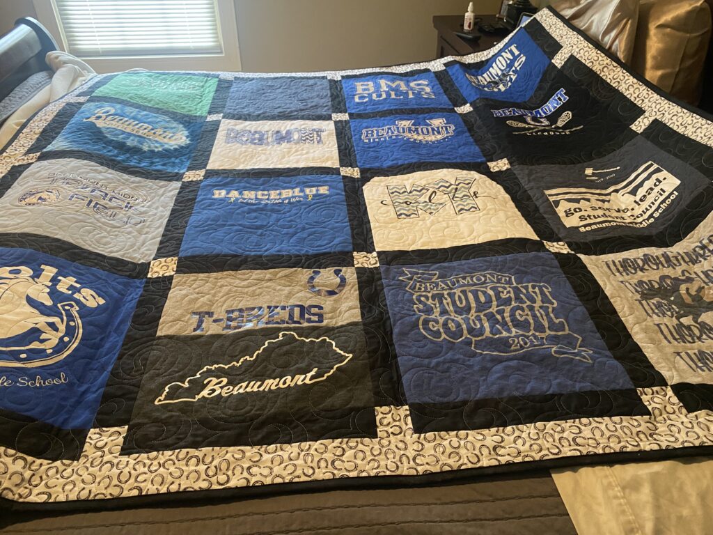 “If anyone asks what I’d like for retirement,” I said. “It’s a t-shirt quilt.” I showed her the folded shirts inside the bags and pointed out the shirts that were most special to me.