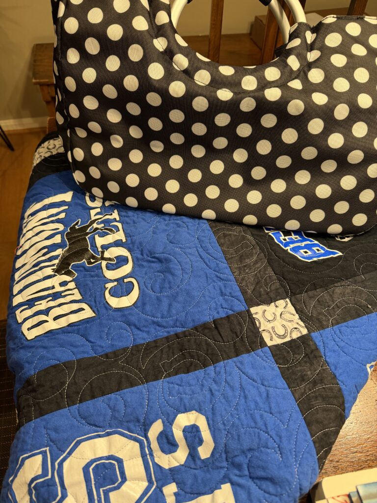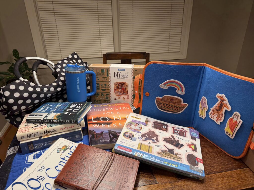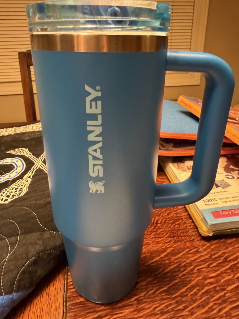 I included the Random House 20th Century Children’s Book Treasury so I can choose some stories to read to my granddaughter, Blair. This is my favorite children’s story collection. I read it to my sons when they were little, used it to analyze story elements with my seventh-grade students, and I have purchased and given a copy as a gift for every baby shower I’ve been invited to since 2001! Of course, I’ll need to bring my Stanley (a gift from the car dealership when I bought my new-to-me car last month) to stay hydrated, and my spirit-wear quilt to keep cozy.
