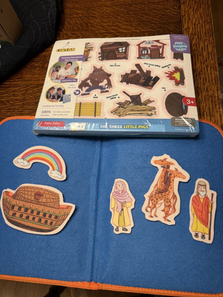 I’m definitely bringing my flannel graph sets. I loved flannel graphs when I was a child. My mom taught Sunday school; so she had several flannel graph sets. She allowed me to play with them as long as I was careful. For those who may not be familiar, flannel graphs include a story (usually typed up in a simple booklet or sometimes on individual sheets of paper). In addition to the story, the flannel graph set comes with colorful figures (similar to paper dolls) printed on stiff flannel. The figures have to be cut out, and there are perforation lines to help with that. While you are reading or telling the story, you move the flannel figures and props on and off the felt board to illustrate the story. In my analog bag, I’m bringing my fairy tales flannel graph set because I have not yet cut out the figures. I included the Bible stories set so you can see how the figures and board look when they’re ready for story time. I was so excited when I discovered flannel graphs were still available. The felt board for these sets converts to a carrying case with pockets for all the characters and props.