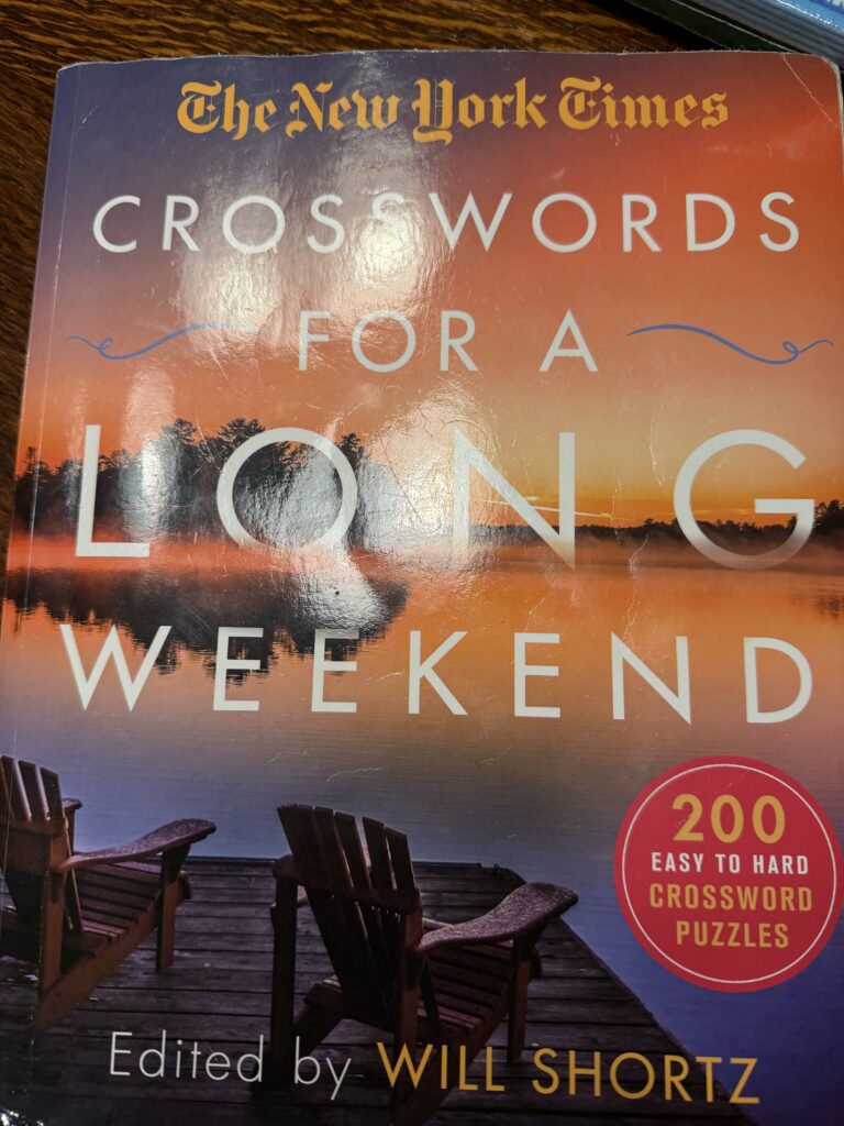 Just in case I need a word-game brain break, I’m bringing our family’s shared crossword puzzle book. We’ve had this book for a couple years now. We take it with us to the beach, but we also leave it in easy reach when we’re at home. My older son, Jack, loves crossword puzzles. My parents are puzzlers as well. The book has so many different people’s handwriting in it, it’s difficult to tell who started the puzzles. My mission is to try to finish any puzzles left incomplete.