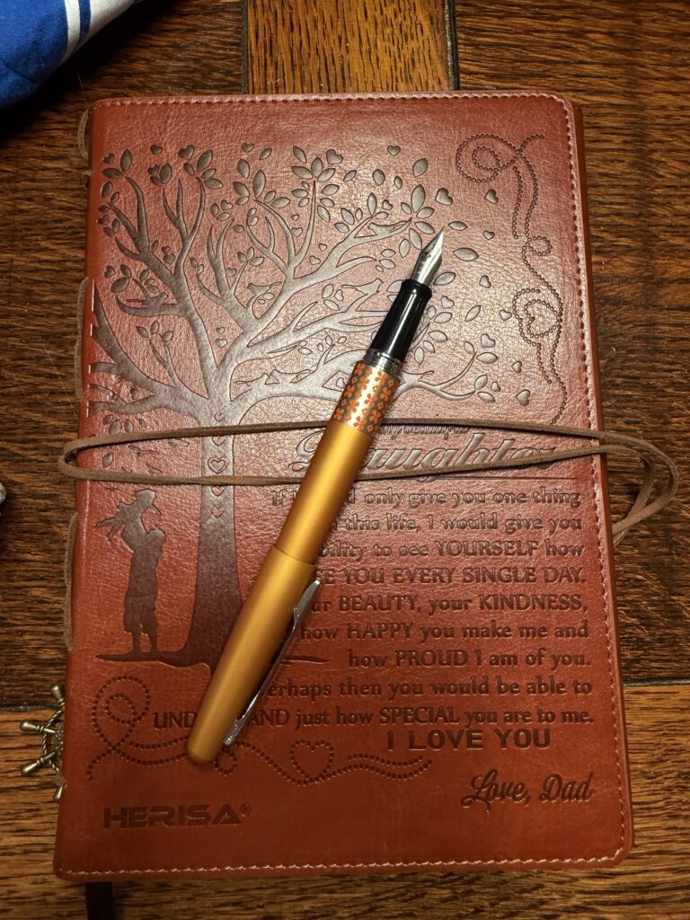 A notebook (given to me by my dad) and a fountain pen (from my small but beloved collection) are also tucked into my bag, along with a short book stack. My book stack includes the One-Year Chronological Bible I’m currently reading through, my favorite author’s most recent book (Anne Tyler’s Three Days in June), and one of my favorite recent reads (The Night in Question by Susan Fletcher). I totally forgot to take a picture of my 52 Book Club journal; but I’m behind on filling out prompts, so I think I’ll bring it anyway. I just won’t be able to check the Facebook 52 Book Club group…but that’s okay. I’m so behind on adding titles, it will take me a while to catch up.