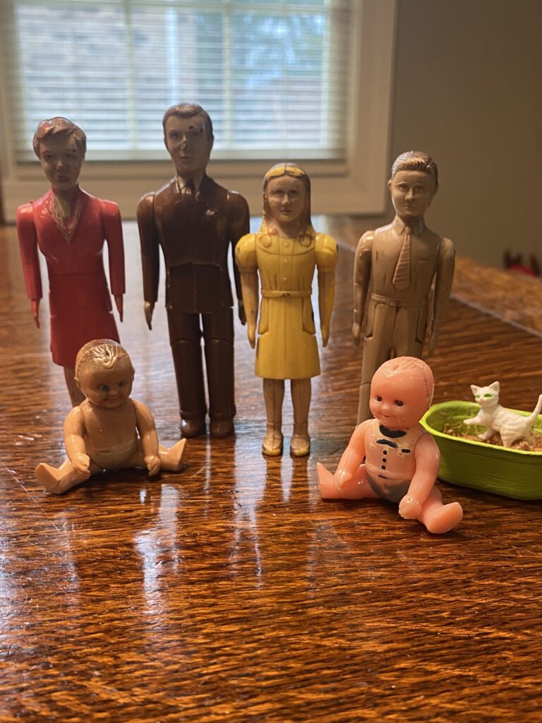 Imagine my surprise, while browsing through a peddler’s mall in a neighboring county, when I found a lumpy ball of Saran Wrap with a hand-written label, “Dollhouse Family, $5.”