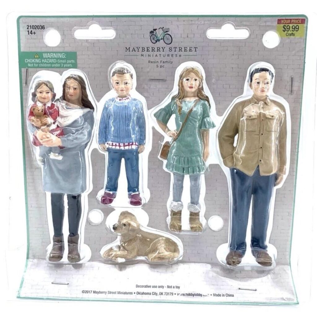 I did not want the resin figures, created by a company called Mayberry Street. The adolescent daughter, wearing a trendy cross-body bag forever, had her hand permanently affixed to her hip. The father’s right hand was sealed in his pants pocket, and the toddler was stuck in the mother’s arms for eternity. I needed dolls with articulated limbs so they could move about their lovely home. The resin people simply would not do.