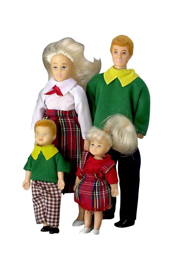 Another option, called Modern Dollhouse Family Blonde, was anything but modern. The mother and daughter sported clouds of platinum-colored hair that I knew would snarl and frizz the minute it was touched by human hands. The father and son were wearing ill-fitting Kelly green sweaters with pointy lime-green collars. This was not the family I wanted for my dollhouse.